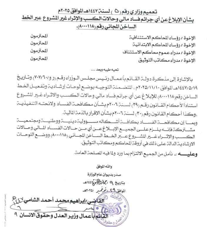 وأكد التعميم على ضرورة التزام جميع الجهات القضائية بتعليق اللوحات الإرشادية الخاصة بالخط الساخن (800118) في أماكن بارزة داخل المحاكم ومكاتب التوثيق، بما يضمن تسهيل استقبال البلاغات من المواطنين حول أي مخالفات مالية أو ممارسات فساد.