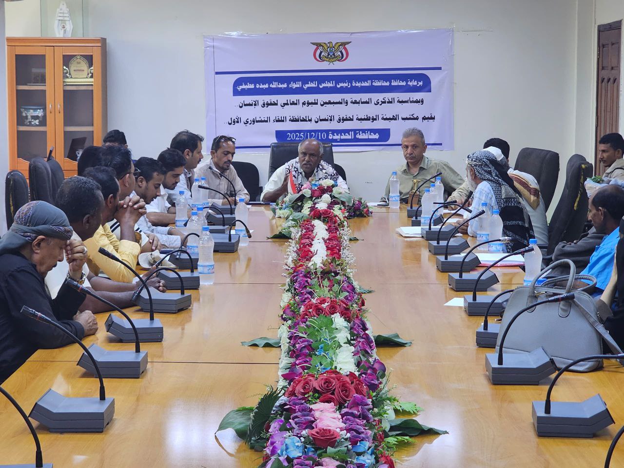 ناقش لقاء تشاوري بمحافظة الحديدة، اليوم، نظمه مكتب الهيئة الوطنية لحقوق الإنسان بالمحافظة، سبل تعزيز حماية حقوق الإنسان ودعم أنشطة فرع الهيئة، تزامناً مع الذكرى الـ77 لليوم العالمي لحقوق الإنسان.