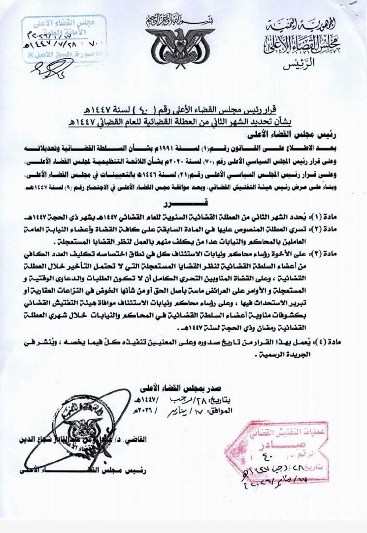 أصدر رئيس مجلس القضاء الأعلى، القاضي الدكتور عبدالمؤمن عبدالقادر شجاع الدين، اليوم، القرار رقم (40) لسنة 1447هـ، بشأن تحديد الشهر الثاني من العطلة القضائية للعام القضائي 1447هـ.