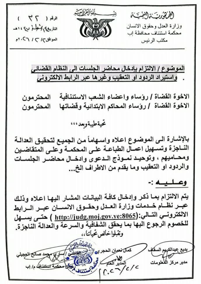 وكانت أصدرت رئاسة محكمة استئناف اب تعميمًا قضائيًا شددت فيه على الالتزام بإدخال محاضر الجلسات والردود والتعقيبات وكافة ما يقدمه أطراف الدعوى ضمن النظام القضائي الإلكتروني، عبر الرابط المعتمد للوزارة.