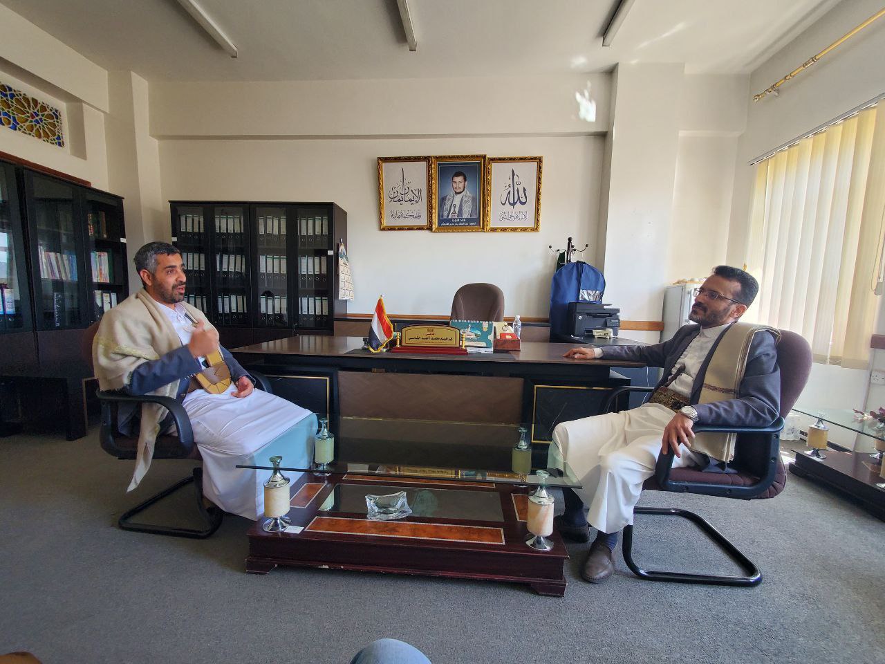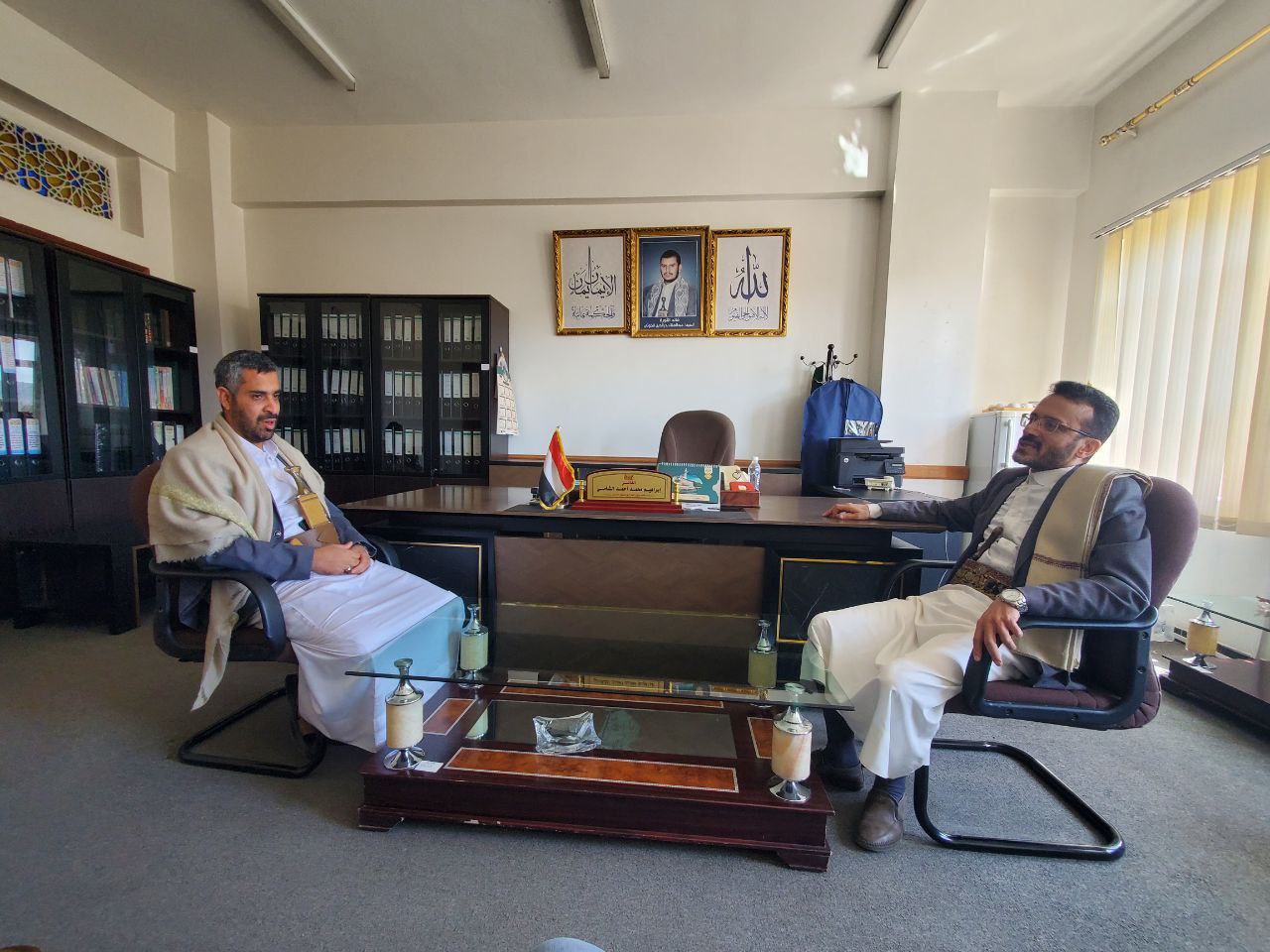 التقى القائم بأعمال وزير العدل وحقوق الإنسان، القاضي إبراهيم محمد أحمد الشامي في مكتبه بديوان عام الوزارة، رئيس مصلحة التأهيل والإصلاح التابعة للوزارة، اللواء إسماعيل عبدالملك المؤيد، في لقاء خُصص لمناقشة عدد من القضايا المتصلة بأوضاع السجون ومرافق الاحتجاز، وسبل تطوير العمل الإصلاحي وتعزيز الجوانب الإنسانية والقانونية المرتبطة به.