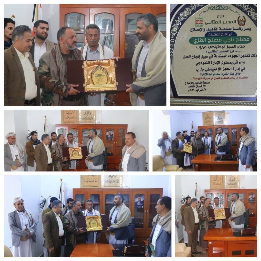 وخلال التكريم أشاد رئيس مصلحة التأهيل والإصلاح اللواء اسماعيل عبدالملك المؤيد، بدور وجهود مدير السجن الاحتياطي بمحافظة إب، العقيد مصلح ناجي مصلح الغزي .. مسلما له درع الوفاء كونه مديرا جيدا ومتميزا وذلك تقديرا لجهوده المبذولة في سبيل إنجاح العمل والرقي به وبالمستوى الإداري والنموذجي في إدارة السجن الاحتياطي بمحافظة إب خلال هذه الفترة منذ توليه الإدارة .. متمنيا له بمزيدا من التقدم والنجاح في مسيرتة الجهادية وبما قام به من تجهيزات وإنشاءات لإدارة السجن وعنابره والخدمات التي قدمها لتطوير العمل.