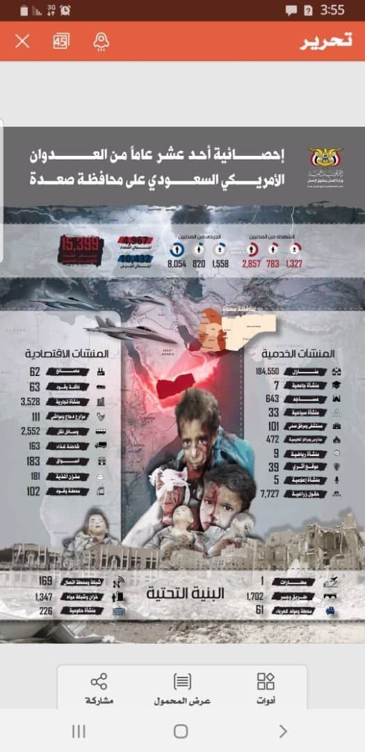 وأضاف أن الخسائر في البنية التحتية كلن لها أيضا نصيبا كبيرا من التدمير، حيث استهدف العدوان مطار صعدة، ودمر 61 محطة ومولد كهرباء، وألف و702 طريقا وجسرا، و 169 شبكة ومحطة اتصال، و ألف و 347 خزان وشبكة مياه، و226 منشآت حكومية.