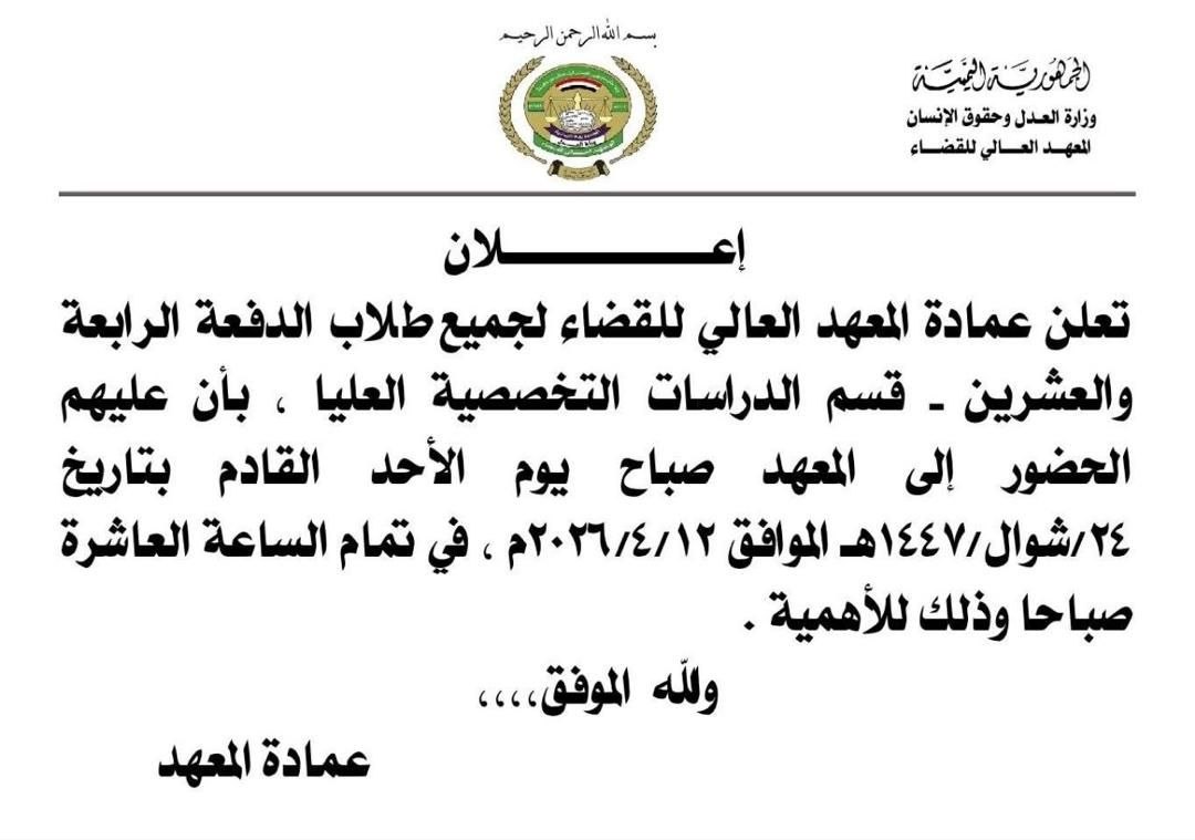 أعلنت عمادة المعهد العالي للقضاء عن موعد حضور طلاب الدفعة الرابعة والعشرين – قسم الدراسات التخصصية العليا، وذلك صباح يوم الأحد الموافق 24 شوال 1447هـ، الموافق 12 أبريل 2026م.