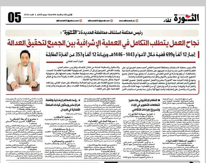 مشيرا في لقاء مطول أجرته معه صحيفة الثورة إلى أن هذه النسبة تمثل زيادة ملحوظة مقارنة بالأعوام السابقة، ويأتي نتيجة جهود حثيثة بذلتها إدارات المحاكم والقضاة والموظفون، والذين عملوا بكل اقتدار لتسريع وتيرة البت في القضايا، كما ساهم التعاون المثمر بين مختلف الجهات المعنية في تحقيق هذا النجاح.