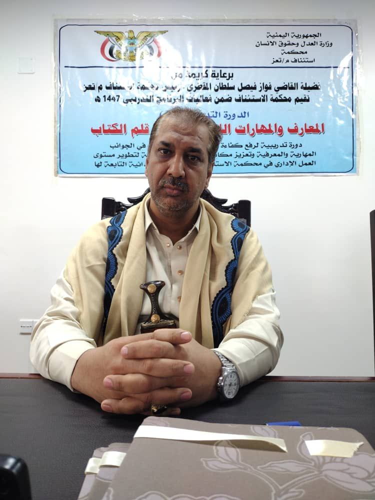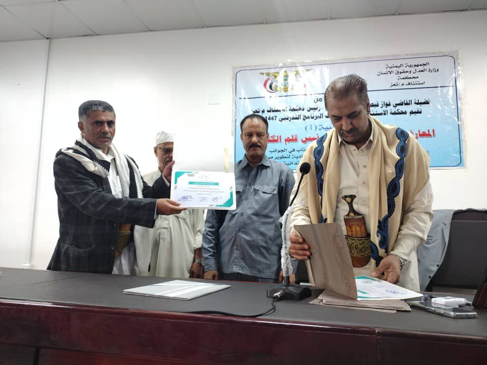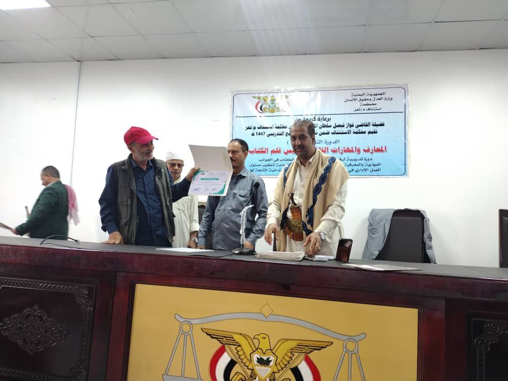 بحضور رئيس محكمة استئناف محافظة تعز القاضي فواز فيصل المقطري اختُتمت اليوم بمحكمة الاستئناف أعمال الدورة التدريبية المعارف والمهارات اللازمة لرؤساء أقلام الكتاب في محكمة الاستئناف والمحاكم الابتدائية التابعة لها، التي نفذتها محكمة الاستئناف ضمن برنامج التدريب والتأهيل المستمر لعام 1447ه.