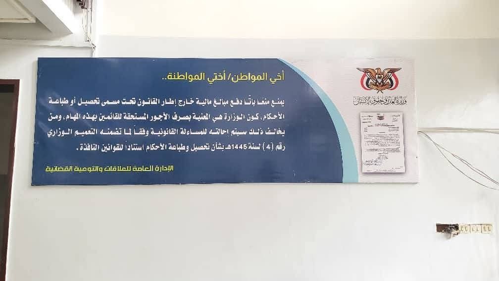 بتوجيهات فضيلة القاضي مجاهد احمد عبد الله، وزير العدل وحقوق الإنسان، أنجزت الإدارة العامة للعلاقات والتوعية والإعلام القضائي خلال الأسبوع الجاري، وبالتعاون مع الإدارة العامة للتجهيزات والشؤون المالية بالوزارة، إعداد وتصميم وتركيب (48) لوحة إرشادية وتوعوية موجهة للموظفين والمواطنين معاً، في عموم محاكم أمانة العاصمة ومحاكم محافظة صنعاء الواقعة في إطار مدينة صنعاء، إلى جانب مكاتب وأقلام التوثيق العقاري في الأمانة والمحافظة، وذلك ضمن المرحلة الأولى من خطة الوزارة في هذا المجال.