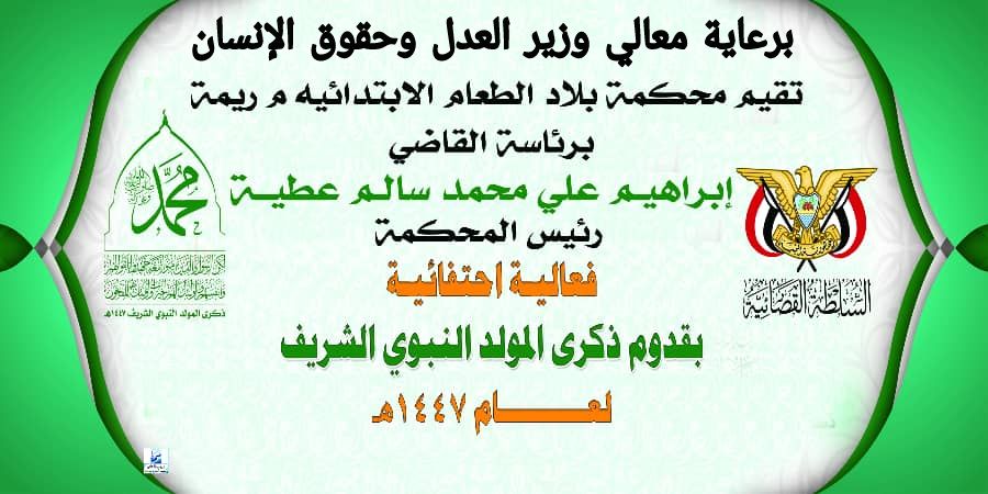 أقامت محكمة بلاد الطعام الابتدائية بمحافظة ريمة فعالية تدشينية بمناسبة المولد النبوي الشريف 1447هـ، بحضور رئيس المحكمة القاضي إبراهيم علي محمد سالم عطية.
