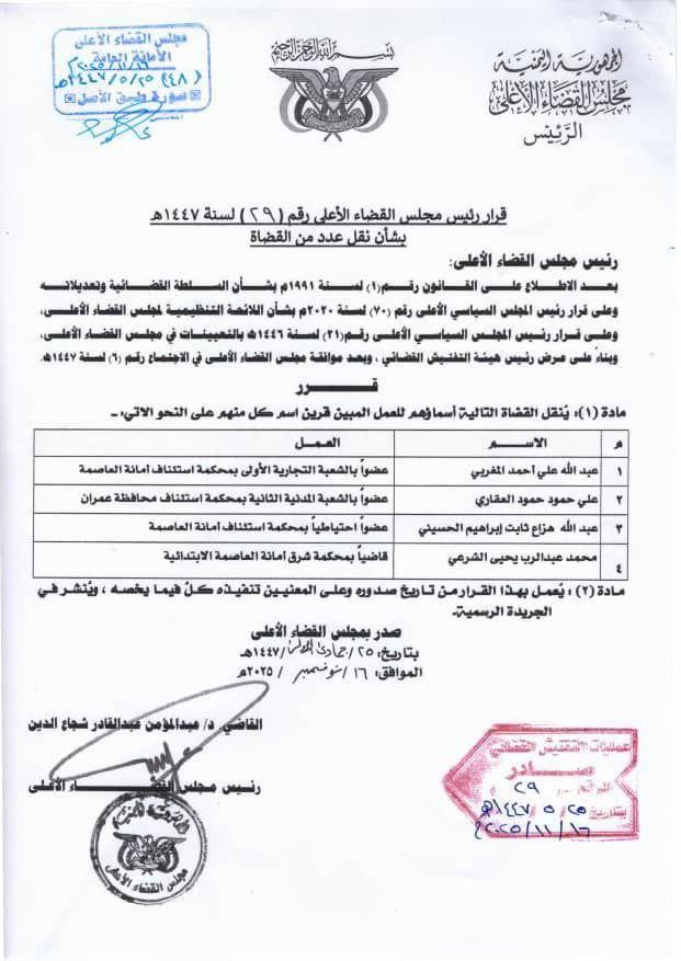 أصدر رئيس مجلس القضاء الأعلى القاضي الدكتور عبدالمؤمن عبدالقادر شجاع الدين،القرار رقم (29) لسنة 1447هـ، بشأن نقل عدد من القضاة للعمل في عدد من المحاكم الاستئنافية والابتدائية، في إطار جهود المجلس لتعزيز الكفاءة القضائية وتغطية الاحتياجات الوظيفية في المحاكم.