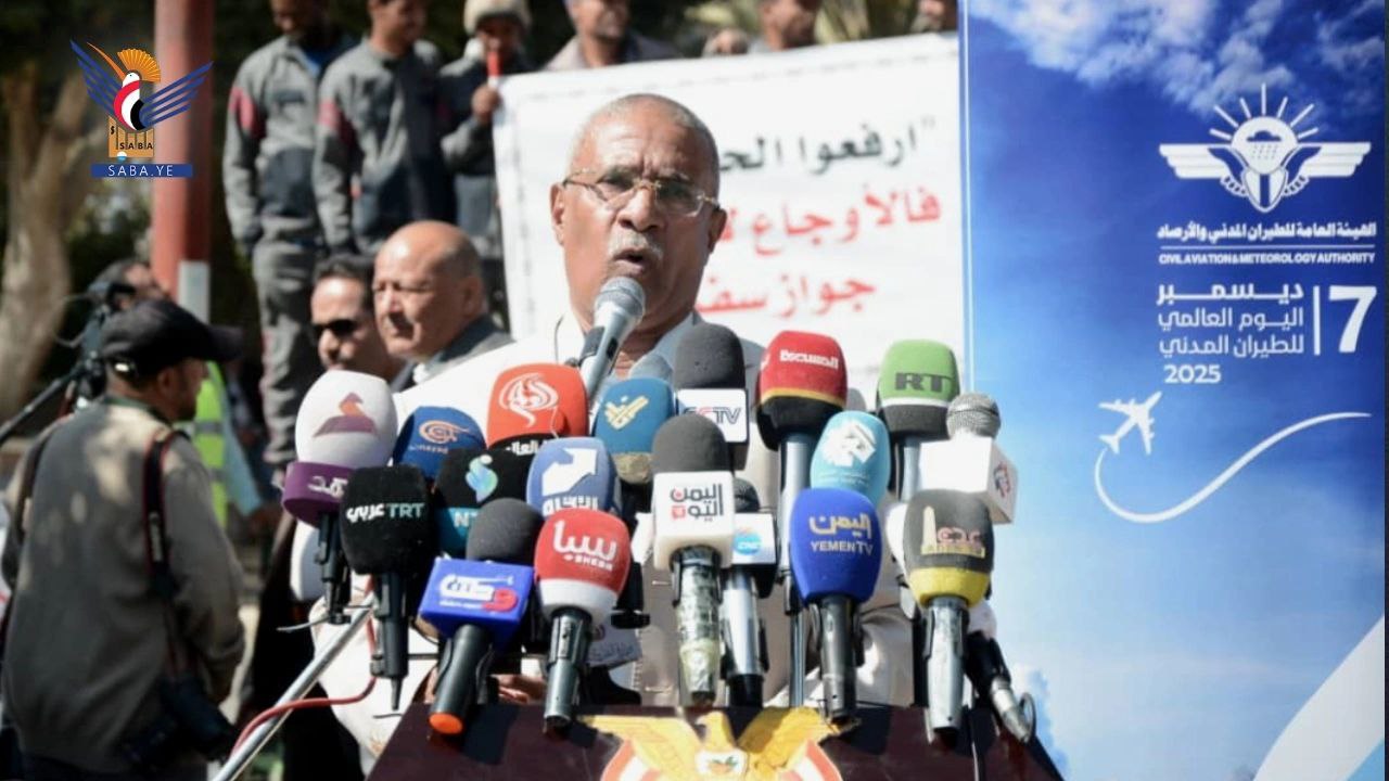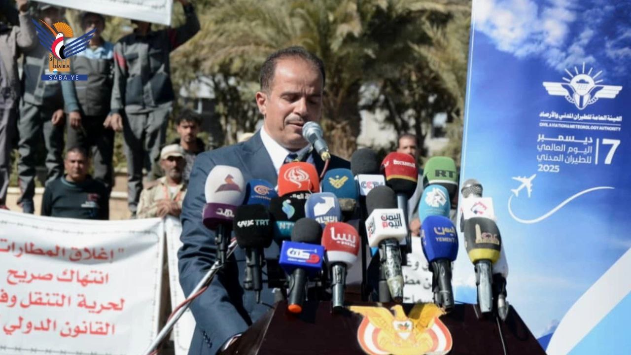 وقال "إن استمرار إغلاق مطار صنعاء يمثل اعتداءً مباشراً على حق ملايين اليمنيين في التنقل والسفر، وانتهاكاً لاتفاقية شيكاغو والقانون الدولي الإنساني".. مؤكداً أن حرمان اليمنيين من سمائهم "ليس إغلاق مطار فقط، بل إغلاق نافذة الحياة أمام شعب بأكمله".