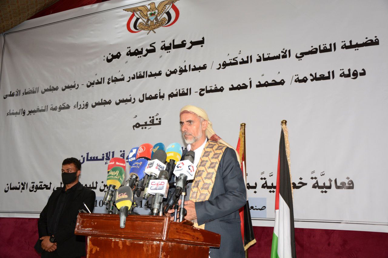 وفي الفعالية التي حضرها نائب رئيس مجلس النواب، عبدالسلام هشول، ووزير الصحة والبيئة، الدكتور علي شيبان،و عضو المكتب السياسي لأنصار الله الدكتور حزام الأسد، وعدد من أعضاء مجلسي النواب والشورى،ورئيس محكمة استئناف أمانة العاصمة، القاضي طه عقبة، وعدد من ممثلي السلطة القضائية ومنظمات دولية ومنظمات المجتمع المدني، أوضح القائم بأعمال وزير العدل وحقوق الإنسان، القاضي إبراهيم الشامي، أن إحياء اليوم العالمي لحقوق الإنسان ليس ابتهاجًا بهذا اليوم، بل هو يوم وقفة ومساءلة وتذكير للعالم بأن الشعب اليمني ومنذ ما يزيد عن عشرة أعوام، يتعرّض لعدوان وحصار شاملين، خلّفا عشرات آلاف الشهداء من المدنيين، معظمهم نساء وأطفال، ودمّرا البنية المدنية، من مدارس ومستشفيات ومطارات ومحطات كهرباء ومياه، وغيرها.