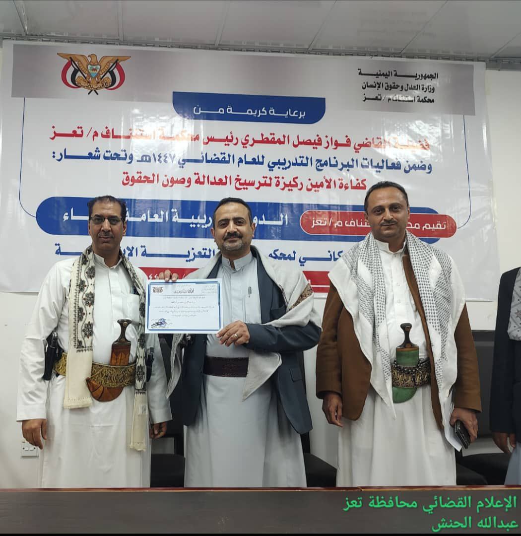 وفي حفل الاختتام الذي جرى بحضور رئيس محكمة استئناف محافظة تعز القاضي العلامة فواز فيصل المقطري ومدير عام محكمة الاستئناف ارحب جميل أكد القاضي فواز المقطري على أهمية تأهيل الأمناء الشرعيين وتطوير قدراتهم المهنية لما لهم من دور محوري في العمل القضائي وحفظ الحقوق وضمان سلامة الإجراءات مشددًا على ضرورة الالتزام بالقوانين واللوائح النافذة والتحلي بالنزاهة والأمانة والمسؤولية الوظيفية.