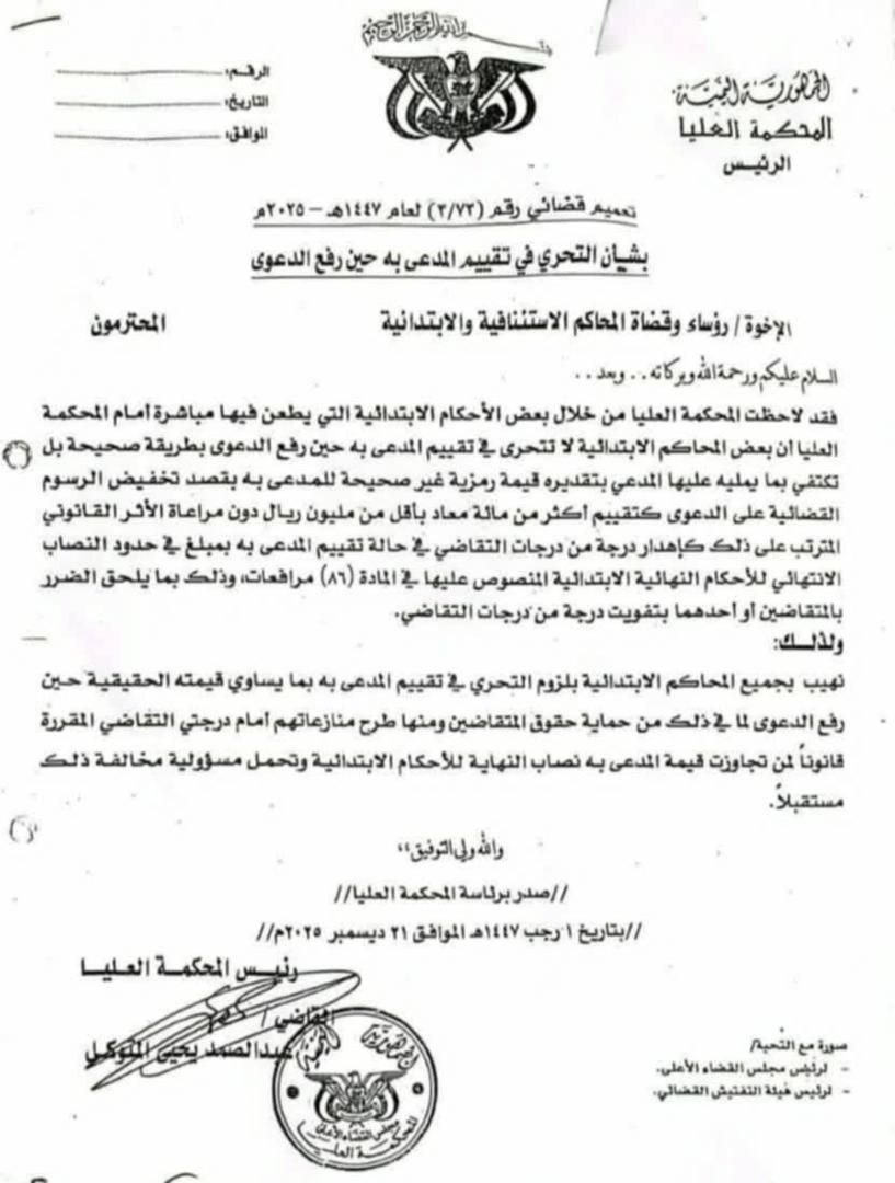 وصدر التعميم برئاسة القاضي عبدالصمد المتوكل، رئيس المحكمة العليا، بتاريخ 1 رجب 1447هـ الموافق 21 ديسمبر 2025م.