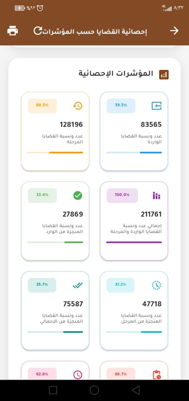 كما أظهرت المؤشرات الإحصائية الرقمية أن إجمالي عدد القضايا الواردة خلال العام 1447هـ والمرحل من الأعوام السابقة بلغ (211,671) قضية، وقد بلغ المنجز منها إجمالي وقدره (75,587) قضية، فيما بلغ المتبقي منها (136,147) قضية.