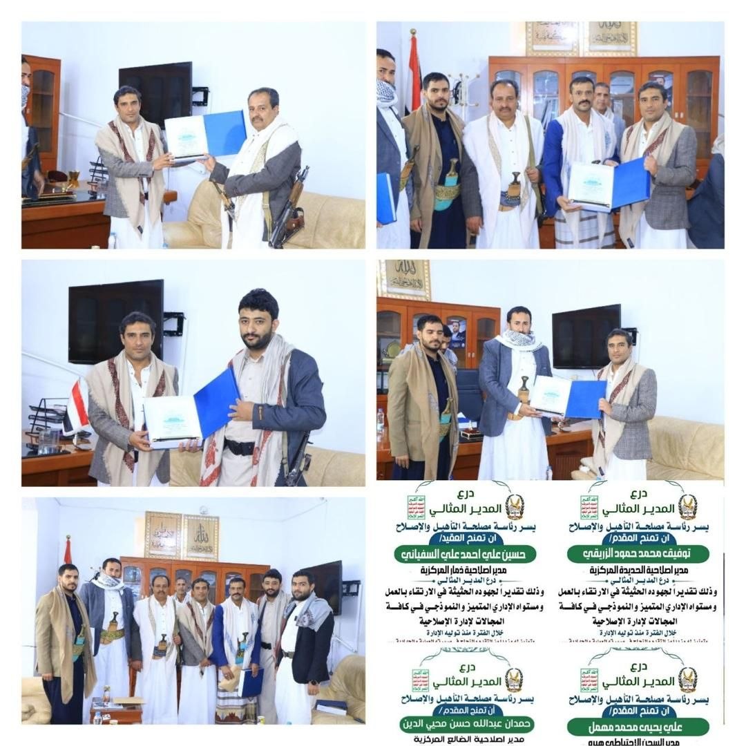 كرم وكيل مصلحة التأهيل والإصلاح بوزارة العدل وحقوق الإنسان العميد محمد محمد الفران ، اليوم مدراء الإصلاحيات المركزية بذمار العقيد حسين السفياني والحديدة المقدم توفيق الزريقي والضالع المقدم حمدان محيي الدين ومدير سجن هبره الاحتياطي بالامانة المقدم علي مهمل، بدروع وشهادات شكر وتقدير، نظرا لجهودهم وعملهم المتميز وإخلاصهم في أعمالهم خدمة للنزلاء.