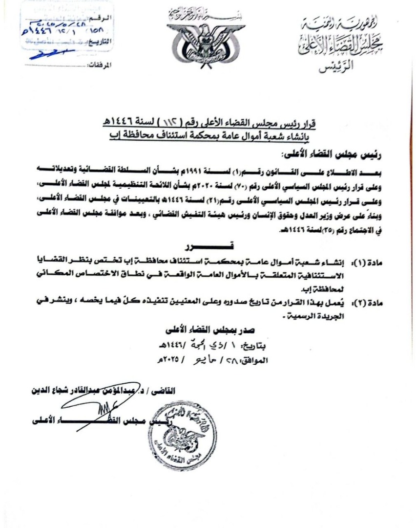 مادة (١): إنشاء شعبة أموال عامة بمحكمة استئناف محافظة إب تختص بنظر القضايا الاستئنافية المتعلقة بالأموال العامة الواقعة في نطاق الاختصاص المكاني لمحافظة إب.