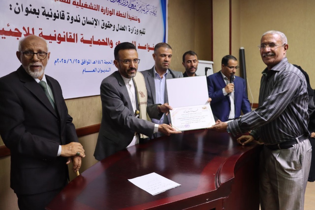وفي الختام، قام نائب الوزير بتوزيع الشهادات التقديرية على المشاركين والمتحدثين، وسط أجواءٍ من التفاعل الإيجابي والتأكيد على أهمية الاستمرار في مثل هذه الفعاليات التوعوية والتأصيلية في المجال الحقوقي والقانوني.