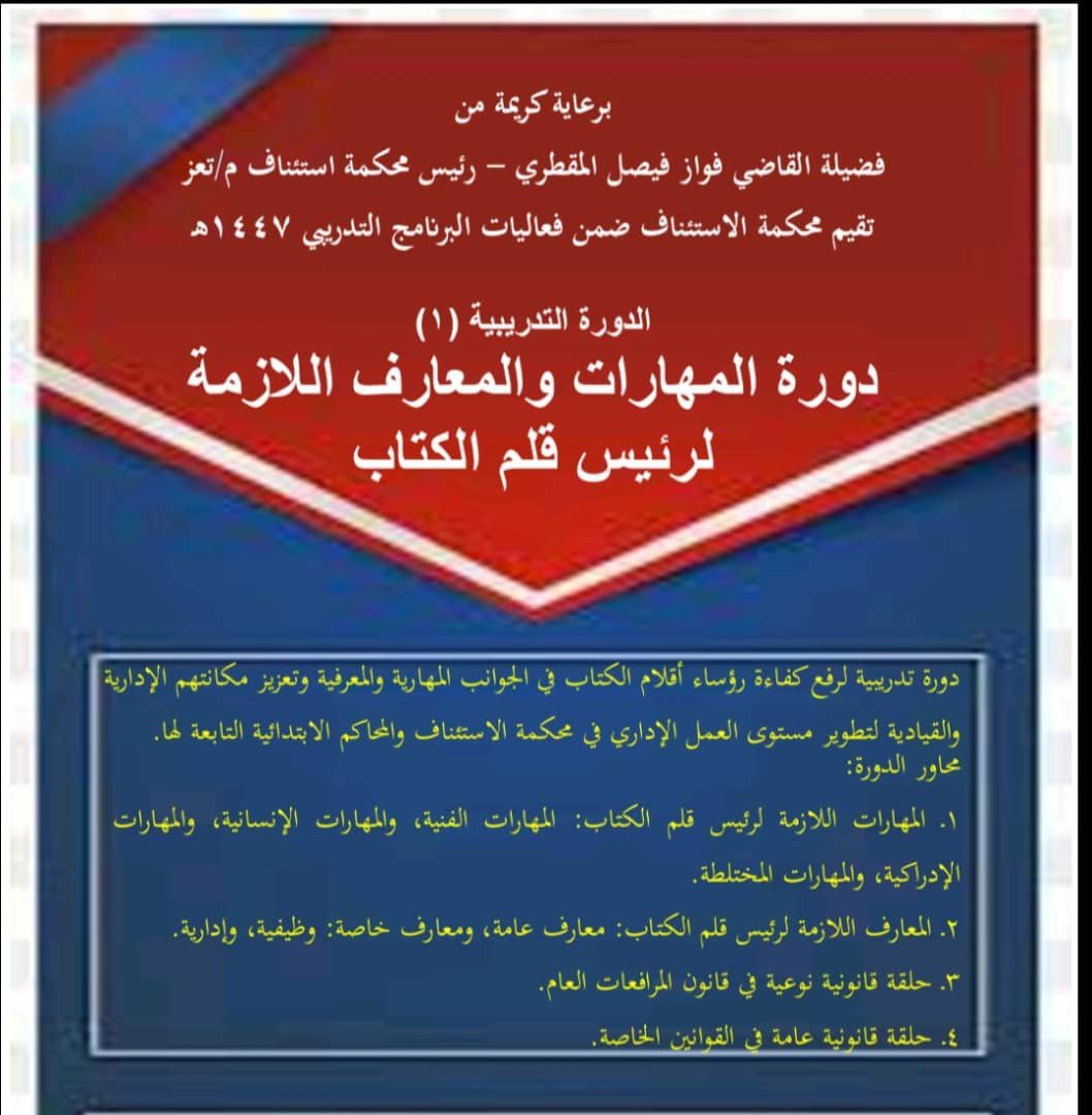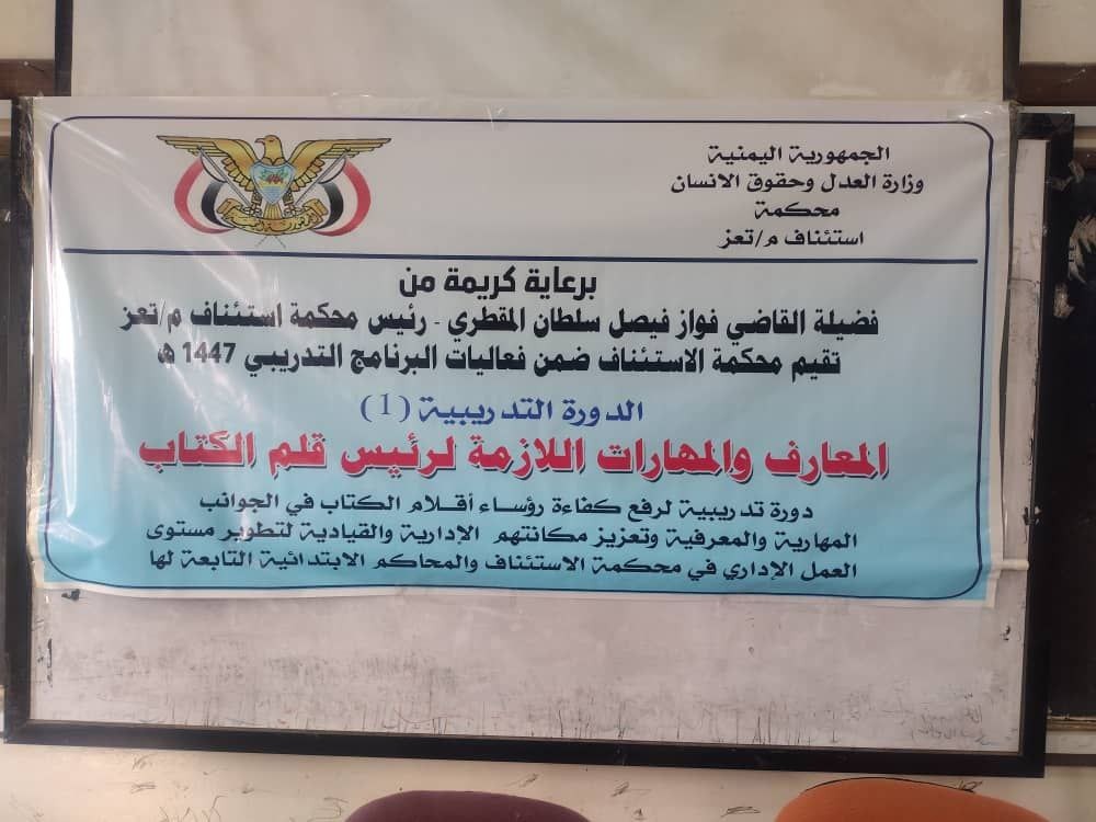 دشن اليوم رئيس محكمة استئناف محافظة تعز القاضي فواز فيصل سلطان المقطري البرنامج التدريبي للعام الهجري 1447 المستهدف لكافة الكوادر الإدارية بمحكمة الاستئناف والمحاكم الابتدائية التابعة لها عبر سلسلة دورات وندوات وورش عمل.
