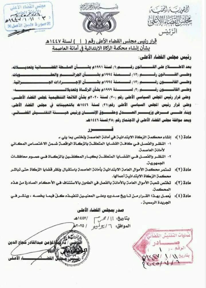 أصدر مجلس القضاء الأعلى ( بتاريخ 11 محرم الجاري) مرسوماً قضى بإنشاء محكمة ابتدائية جديدة متخصصة بقضايا الزكاة في أمانة العاصمة، وذلك في إطار تعزيز وتطوير المنظومة القضائية وتبسيط إجراءات التقاضي المتعلقة بالزكاة على مستوى الجمهورية.