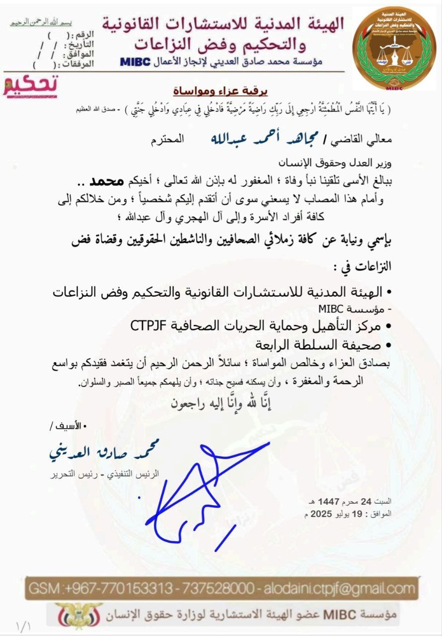 بعث الرئيس التنفيذي للهيئة المدنية للاستشارات القانونية والتحكيم وفض النزاعات الاستاذ محمد صادق العديني ، برقية عزاء ومواساة إلى وزير العدل وحقوق الإنسان القاضي مجاهد أحمد في وفاة أخيه محمد .