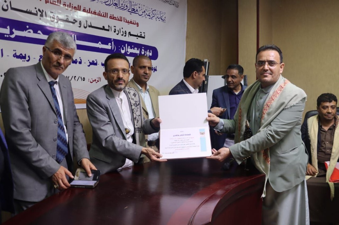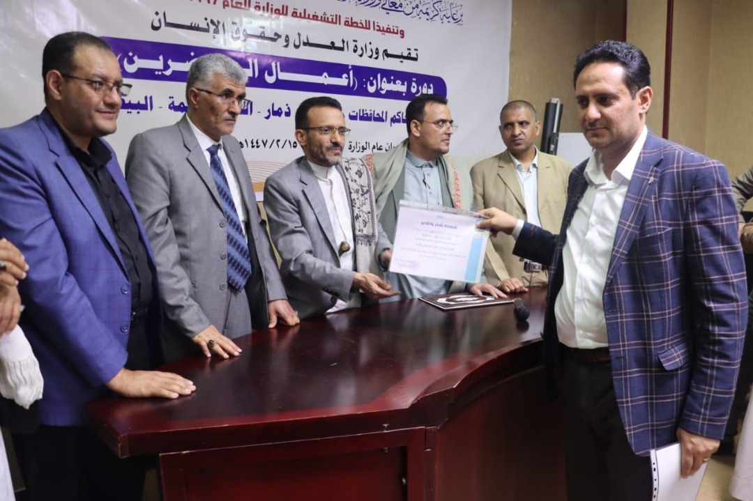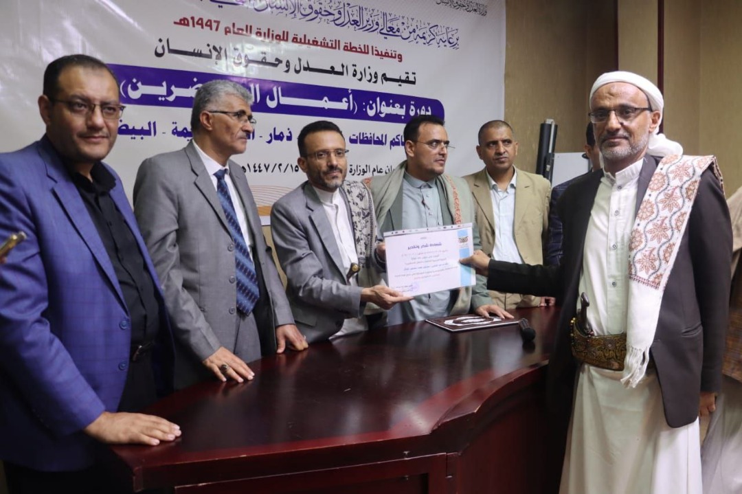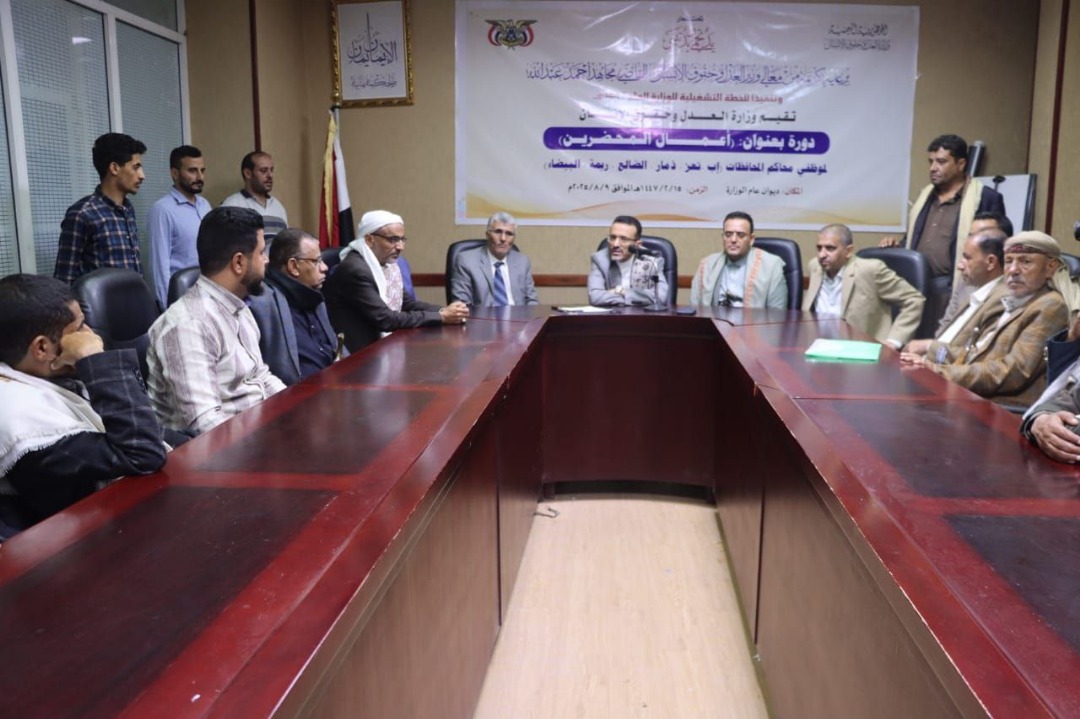 بحضور نائب وزير العدل وحقوق الإنسان القاضي إبراهيم محمد الشامي، اختتمت وزارة العدل وحقوق الإنسان، اليوم في العاصمة صنعاء، أعمال الورشة التدريبية الخاصة بأعمال المحضرين، التي استمرت خمسة أيام، بمشاركة ٣٢ من المحضرين العاملين بمحاكم محافظات إب وتعز وذمار والضالع وريمة والبيضاء.