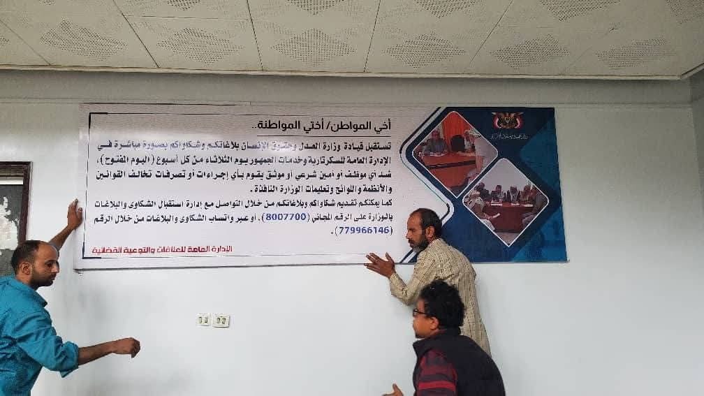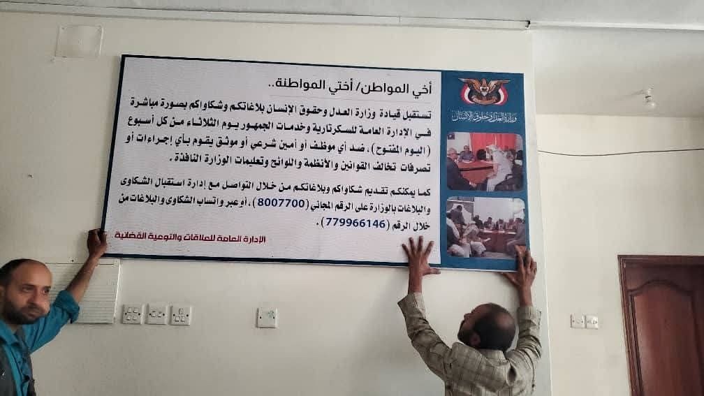 بتوجيهات فضيلة القاضي مجاهد احمد عبد الله، وزير العدل وحقوق الإنسان، أنجزت الإدارة العامة للعلاقات والتوعية والإعلام القضائي خلال الأسبوع الجاري، وبالتعاون مع الإدارة العامة للتجهيزات والشؤون المالية بالوزارة، إعداد وتصميم وتركيب (48) لوحة إرشادية وتوعوية موجهة للموظفين والمواطنين معاً، في عموم محاكم أمانة العاصمة ومحاكم محافظة صنعاء الواقعة في إطار مدينة صنعاء، إلى جانب مكاتب وأقلام التوثيق العقاري في الأمانة والمحافظة، وذلك ضمن المرحلة الأولى من خطة الوزارة في هذا المجال.