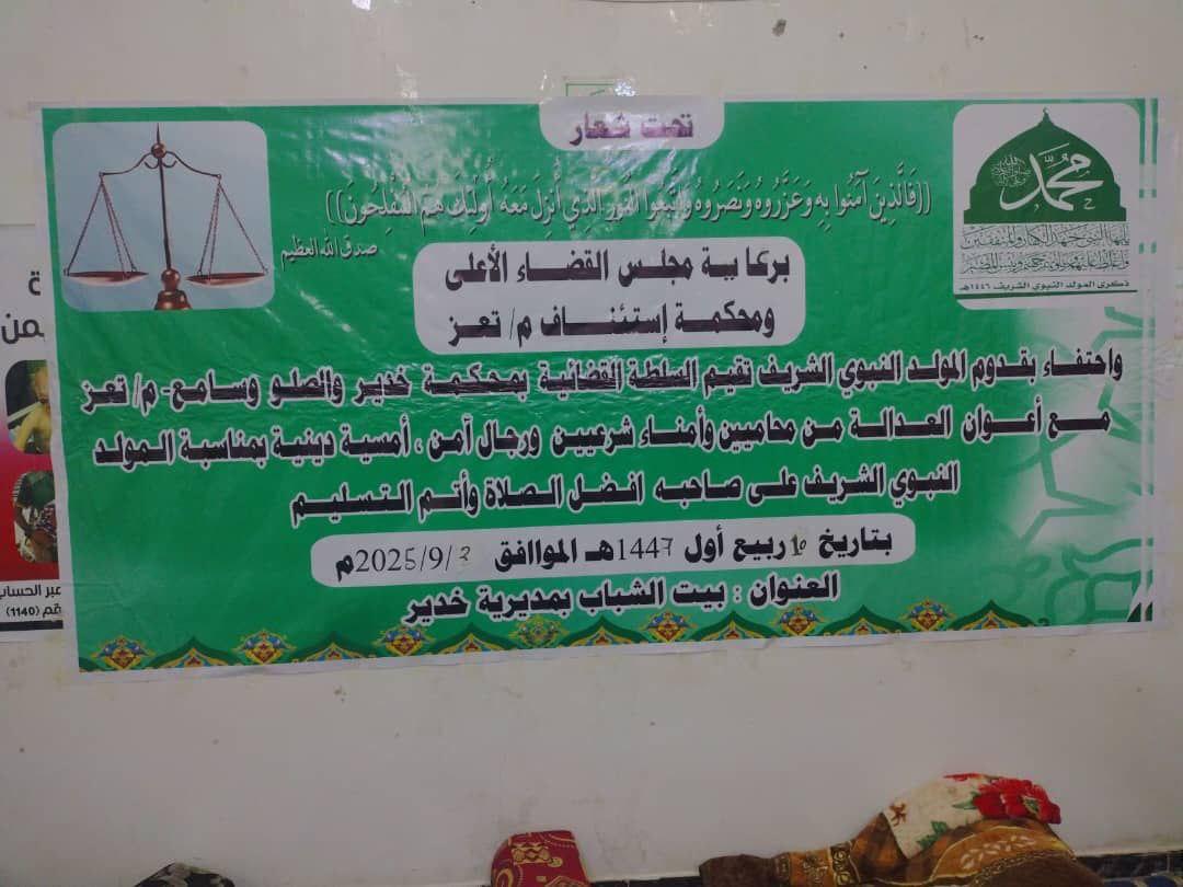 برعاية مجلس القضاء الأعلى ورئيس محكمة استئناف محافظة تعز ،أقامت محكمة خدير والصلو وسامع الإبتدائية أمسية دينية احتفائية بمناسبة قدوم ذكرى المولد النبوي الشريف على صاحبه وآله أفضل الصلوات وازكى التسليم.تحت شعار "لبيك يا رسول الله"، بحضور رئيس محكمة خدير والصلو وسامع الابتدائية القاضي علي صالح القادري ورئيس قلم التوثيق عبدالله رسام ورئيس قلم التنفيذ منصور الحجري ورئيس وحدة التوثيق خالد حيدره وموظفي المحكمة والأمناء الشرعيين والمحامين وعدد من الشخصيات الامنية والاجتماعية بالمديرية.