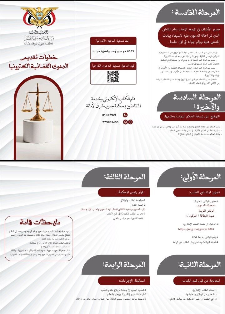 واشار الوكيل إلى أهمية البروشور التوضيحي الذي أعدته المحكمة كجانب توعوي وإرشادي يوضح للمتقاضين خطوات تقديم الدعاوى القضائية إلكترونيًا، بما يسهم في تعزيز الشفافية، والحماية من الابتزاز، وتبسيط الإجراءات، وتسهيل وصول المتقاضين إلى خدمات العدالة الرقمية.