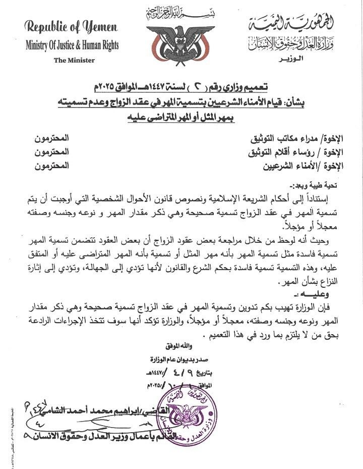 أصدرت وزارة العدل وحقوق الإنسان تعميمًا وزاريًا رقم (2) لسنة 1447هـ الموافق 2025م، قضى بإلزام الأمناء الشرعيين بتسمية المهر في عقود الزواج تسمية صحيحة ومحددة، وعدم الاكتفاء بتسميته بـ"مهر المثل" أو "المهر المتراضى عليه"، لما في ذلك من مخالفة لأحكام الشريعة الإسلامية ونصوص قانون الأحوال الشخصية.