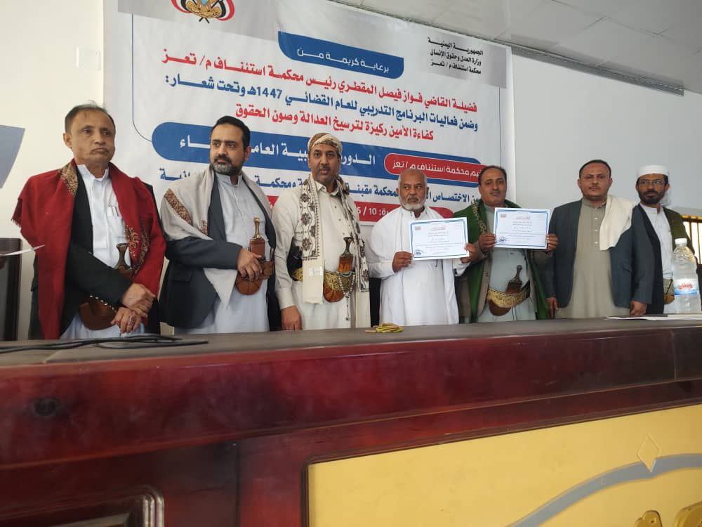 اختُتمت اليوم الدورة التدريبية العامة للأمناء الشرعيين في نطاق اختصاص محكمة مقبنة الابتدائية ومحكمة صبر الابتدائية التي نظّمتها محكمة استئناف محافظة تعز ،ضمن برنامجها للعام القضائي 1447ه بعنوان كفاءة الأمين ركيزة لترسيخ العدالة وصون الحقوق.